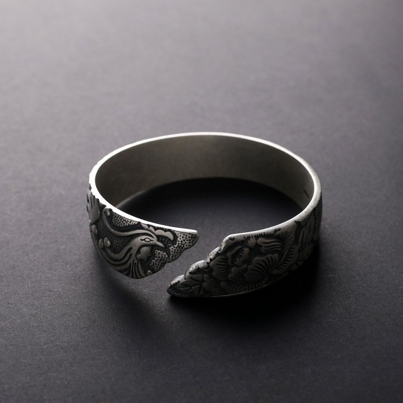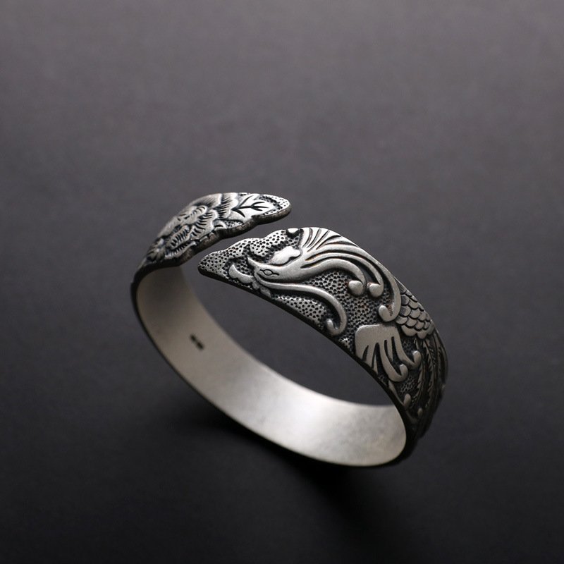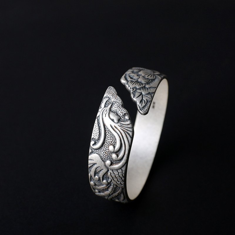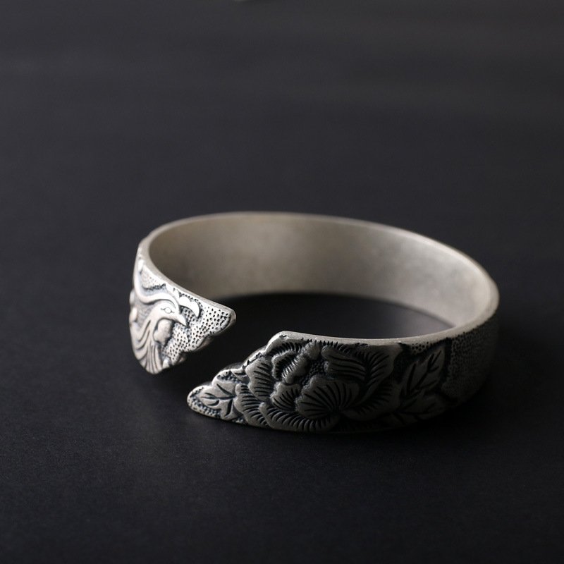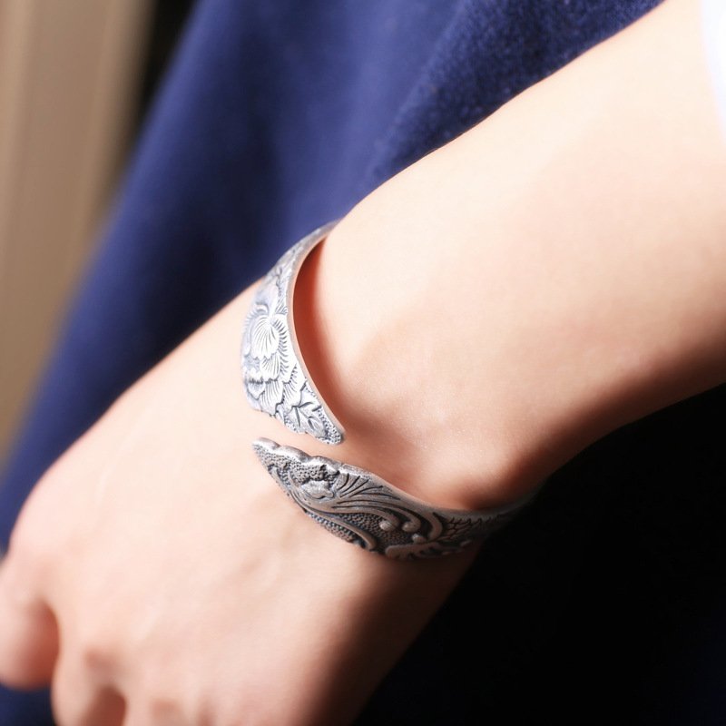 S999 Pure Silver Phoenix Peony Wide Side Thai Silver Matte Retro Ethnic Style Bracelet Women