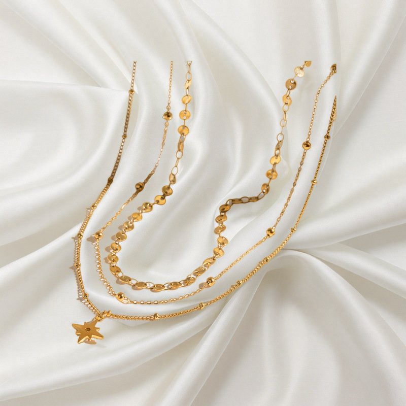 Stainless Steel Rhinestone Four Eight-pointed Stars Pendant Three-layer Necklace