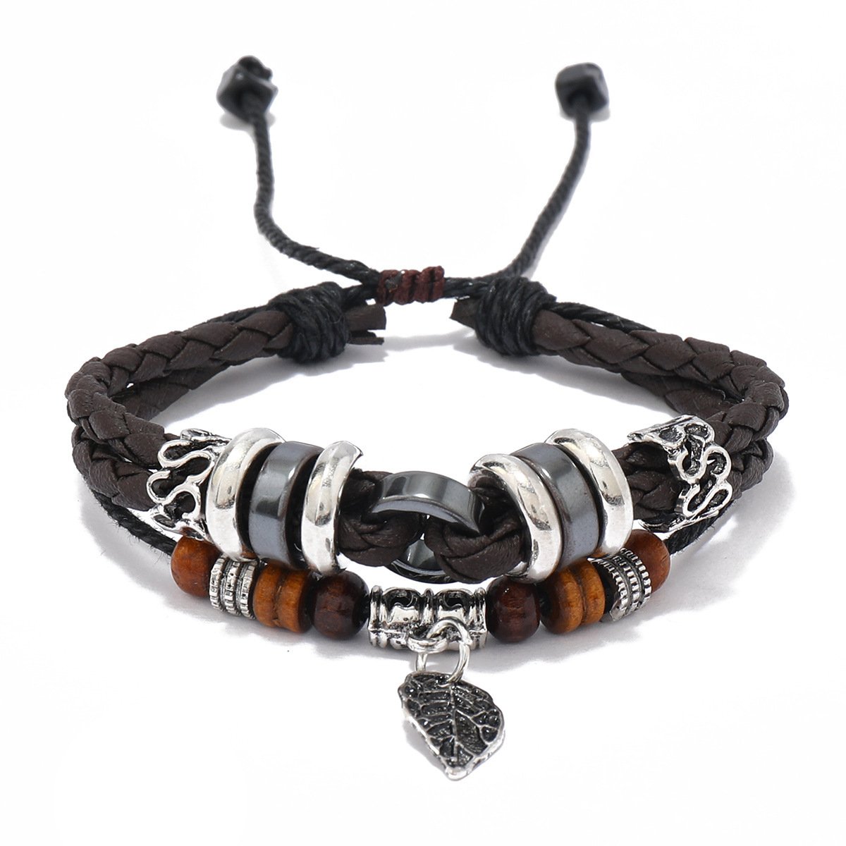 Woven Leaf Pendant Men’s Leather Bracelet Simple